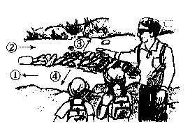 下の図の河原の石は水の流れによって特ちょうのある並び方になっています。水の流れは1〜4のうち2です。