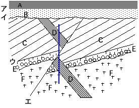 (1) イはいったん隆起して陸とな り風化されています。そのあと沈降して海底(湖底)となり、B、Aの地層がたい積しているので、不整合面となります。