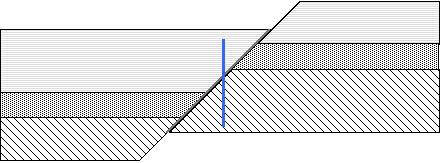 このようにたてに線を引いて、お互いの断層が線の上に重 ならずに離れてしまっているときは、 正断層となります。 両側からひっぱられて一方の断層がずり下がった状態で す。(考察参照)