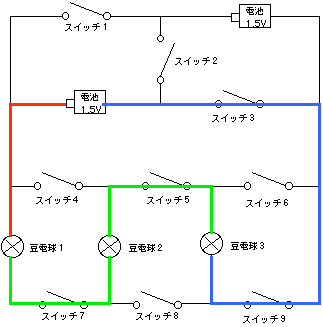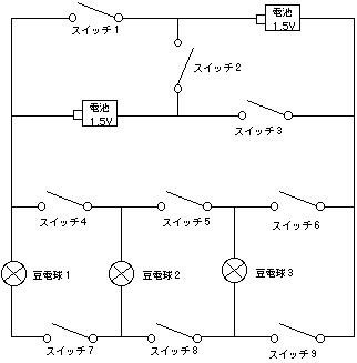 一例をあげると、右図のように、スイッチ5、7、9が「入」になってい るとき、豆電球はすべて点灯します。