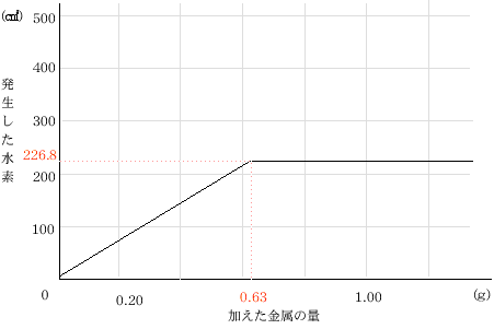 グラフより、アルミニウム1gあたりで発生する水素は、