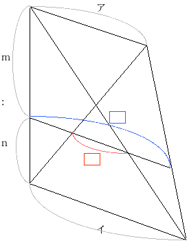 上の図で、□と□の長さをもとめなさい。ア=4cm イ=6cm、 m:n=7:3とします。