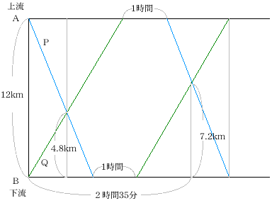 に往復する船P,Qがあります。船の静水上の速さは同じです。出発して2時間35分後にBから7.2kmのところで2度目に
