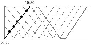 上図のように、5回すれちがいます。10時以前に発車している電車も忘 れないよ うにしましょう。