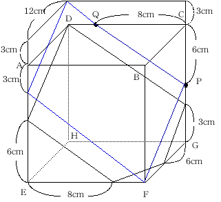 頂点Hを台につけたまま傾けたところ、水面は、3点F,P,Qを通る平面と平行な平面になりました。ただし、Pは辺CG上の
