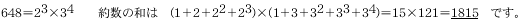 648の約数の個数とその和を求めなさい。