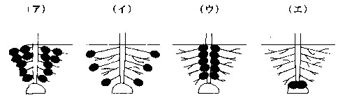 ジャガイモを土に植え、3ヶ月たったとき、子イモができました。子イモのつきかたとして正しいものはイです。