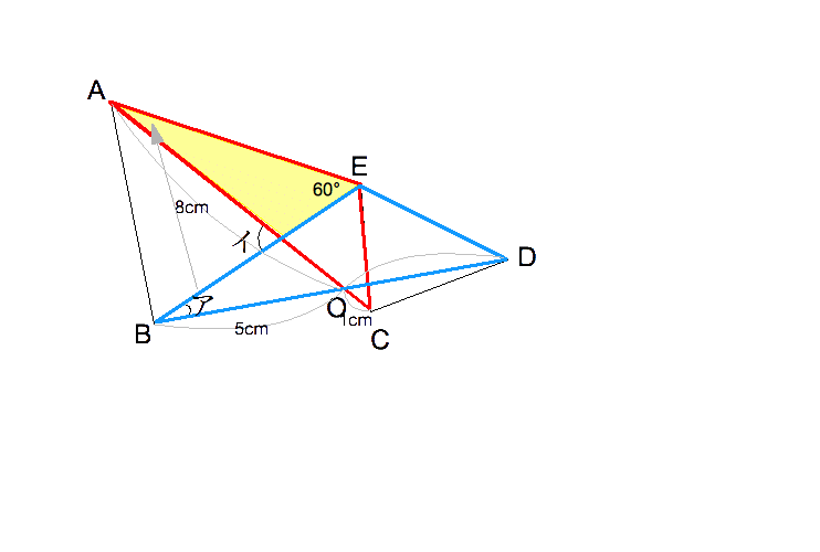 [10] 図をクリック!赤い三角形と青い三角形が合同となるので(2辺とその間 の 角がそれぞれ等しい)、辺AC=辺BDより、OD=(8+1)cm−5cm=4cmであり、アの角を→のAに移動して考えると、黄色い三角形の1つの外角 がイであるので、イ=60°+23°=83°