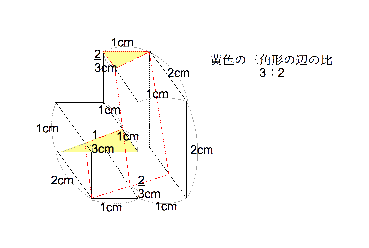 [13] 黄色い三角形の直角をはさむ辺の比が3:2であることを使う。図のような断頭四角柱になるの で、底面積に高さの平均をかけて、1㎠×(1/3+2/3)÷2+2㎠×(2/3+2)÷2=19/6㎤ である。