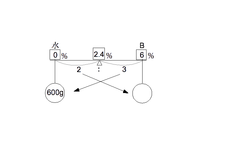 「Bの食塩水にさらに600gの水を加える」とあるので、次のてんびん図より、600÷3×2=400gがBの量、よってB:C=1:2よ りCの量は、400g×2=800gとわかる。