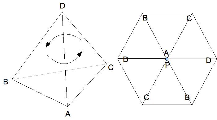 図のように、A(P)のまわりに、BCDBCD・・・と回転して行く。1周ではなく2周するので、360×2=720°の約数で あ り、360°の約数でな いものをX°としてさがす。240°はあてはまるが、240×3個=720°となり三角すいにならない。144°も 144×3=432°となり不適。頂点 Aのまわりに3個分で360°以内でおさまるのは、80°が最大で、最小は16°である。