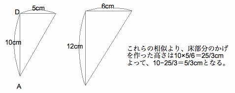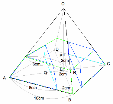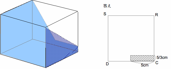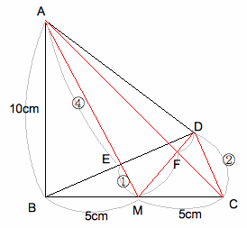 また、三角形AMC=5×10÷2=25㎠=三角形AMD(= 三角形ABM) よっ て、CDとAMは平行である。だから三角形AMFと三角形CDFは相似となり、AM:CD=(4+1):2=5:2である。 (なぜなら、ピラミッドBCD からEM:DC=1:2) すなわち、MF:FD=5:2となることがわかる。MF=5cm÷(5+2)×5=25/7cm である。