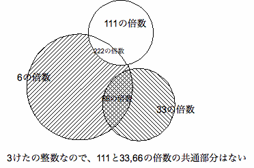 すなわち6の倍数から222の倍数を取り除き、33の倍数から111の倍数を取り除き、その両方またはどちらか一方に含 まれ る整数の個数を求めればよい。