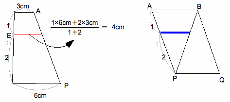三角形BEMと三角形AEBが相似なので、それらと もう1つ相似な三角形ABMのとなりあう辺の比 10cm:5cm=2:1から、ME:BE=BE:AE すなわち1:2=2:4 がいえる。よってAE:EM=4:1