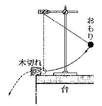 上の図のように、ふりこをテーブル上の木切れに当てて、木切れが飛ぶ