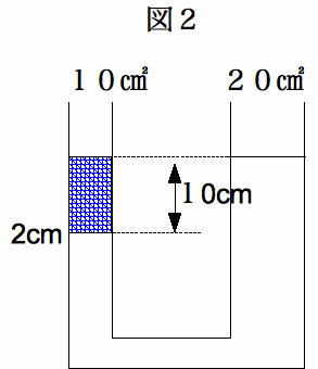 (1) 図1のように、断面積10㎤と20㎤のU字 管に水を入れたものがあります。この左の管に図2のように、断面積10㎠、厚さ 2cmの円筒ピストン(斜線部分)をぴったりはめこんだところ、左右の水位の差が10cmになりました。このピストンの重さはいくらです か。ただし、ピストンはなめらかに動き、水はもれてこないものとします。