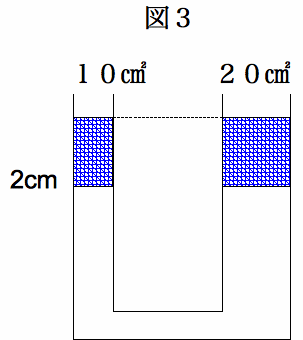 (2) 図2の状態から、図3のように、右の管に断 面積20㎠、厚さ4cmの円筒ピストン(斜線部分)をぴったりはめこんだところ、左 右の水位が同じになりました。右のピストンの重さはいくらですか。また、左の管のピストン1㎤の重さと、右の管のピストン1㎤の重さとの 比を、簡単な整数比で答えなさい。