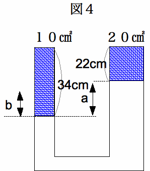 また、このとき、この12cm分の水は管の断面積の比1:2の逆比で2:1の高さで移動したと考えられるので、 12cm÷ (1+2)×2=8cm左で下がり、4cm右で上がったと考えられる。よってb=8cm 答え a=12cm、 b=8cm