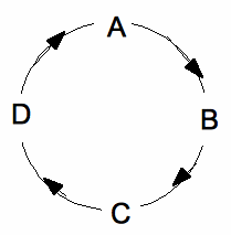 4人のとき、4人で循環する場合が、下図のように4つの円順列になるので、 (4−1)!=3×2×1=6通りある。2人と2 人でそれぞれ循環するときは、例えばA君を固定し、その相手をB,C,D3人から1人選ぶので、3通りあり、残り2人は自動的に決定す る。よって、6+3=9通り