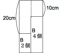 4cm×3+6cm×3=30cm または、4cm×6+6cm×1=30cm となるので、(A’、C’)=(3、3) 、(6、1) すなわち(A、C)=(6、12)、(12、4) となる。・・・@Bを分けて積むとき、下図のように、2個と4 個に分けて積み(奇数個は積めな い)、上部のすき間は20cm、10cmとなるので、A'とC’で4cm×2+6cm×2=20cm積め、 4cm×1+6cm×1=10cm が積める。このとき、(A'、C')=(3、3)すなわち、(A、B)=(6、12)となる。・・・A よって@Aより、(6、 12)、(12、4)の2通りだけとなる。