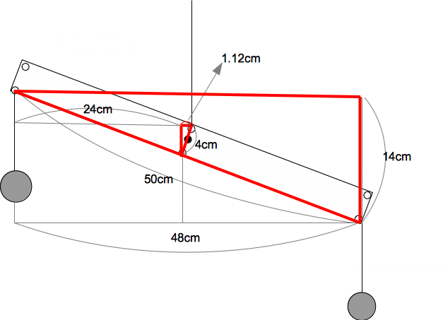 次に下図のように、赤い2つの相似な三角形の辺の比より、4cm×14/50= 1.12cm すなわち 1.12cm+24cm=25.12cmがてこの左側の水平距離となる。
