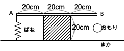 図のように 棒ABを幅20cm高さ20cmの台の上に置き、端Aに自然長12cm、100gで2cmのびるばねを取り付けました。