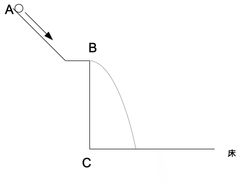 図のように点Aから手をはなした物体が斜面をすべり、点Bから水平方向に空中へ飛び出した後、地面 に落下した。