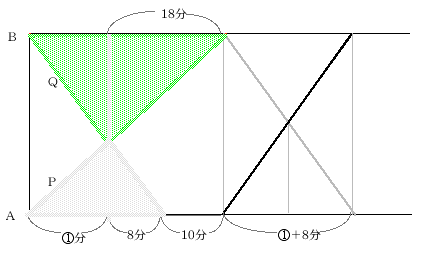 中学受験算数ーダイヤグラムと相似 プロ家庭教師 のページへP君はA地を、Q君はB地を同時に出発して、それぞれB地、A地へ向い ます。1回目の出会い後P君は18分でB地に着き、Q君は8分後にA地に着きました。Q君はA地で10分休んだ後、行きと同じ速さで B地にもどり、P君は行きよりも速い速さでA地にもどると、2人は同時にそれぞれB地A地に着きました。2回目の出会いはP君がA地 を出発してから何分後ですか。