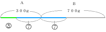 Bの容器で起こってい ることを考えます(もちろんAでもかまいません)。2つの容器の濃度を同じになったのですから、1000gすべてを3:7で混ぜた濃度と同 じです。上の図で、青い線の部分が等量交換した食塩水です。Aの容器の中の青い線の食塩水と、Bの容器の中の緑の線 の食塩水を3:7の比で混ぜれば「同じ濃度」になるはずです。すなわち、Bの食塩水700gを3:7に分ければよい ことになります。