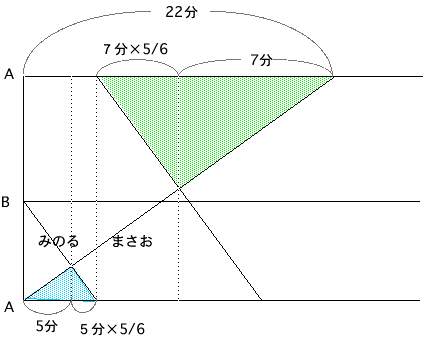 くるくると目が回りそうですね。Aで切り開いて普通の線分図にする方法もありますが、余計にわかりずらくなる人も多いでしょう。時間と速さが苦手だという人は、下のようなダイヤグラムを書いてみましょう。緑と青の三角形の部分に道のり一定、速さと時間の逆比の関係を使って、7分×5/6+5分×5/6=10分がわかります。あとは同じです。