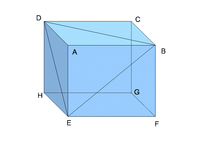 1辺の長さが6cmの次の図のような立方体が あります。3頂点B,D,Eを通る平面で切り、三角すいA-BDEを切りすて、さらに3頂点A,C,Fを通る平面で切り、頂点Bの方 の立体を切りすてた残 りの立体の体積を求めなさい。