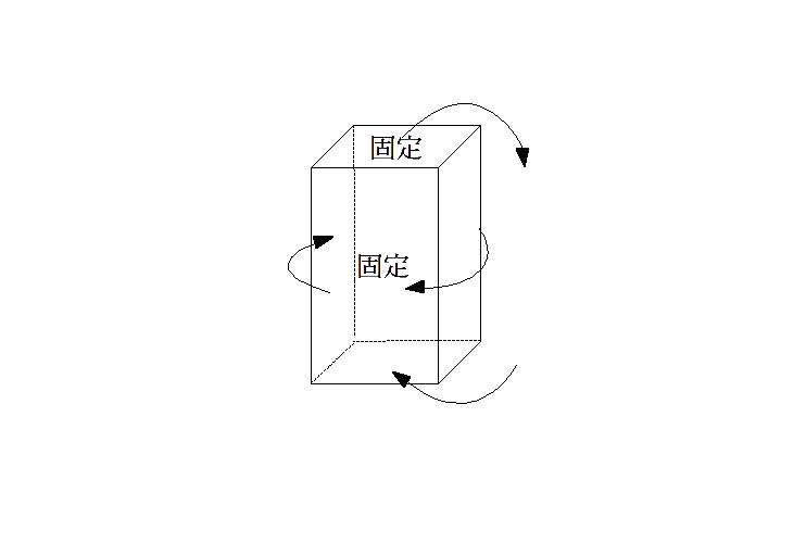 図のようにたて方向と横方向に回転できるので、重なりが起きる。面は底面と側面の2通 りあり、その どちらかに"ある1色”をぬって固 定する。"ある1色” を上の底面にぬったとき、その対面は5通り のぬり方 があり、つぎに正面の側面に"他のある1 色”をぬり固定すると、残り3色のぬりかた は3×2×1=6通りある。よって、5×6=30通 り。