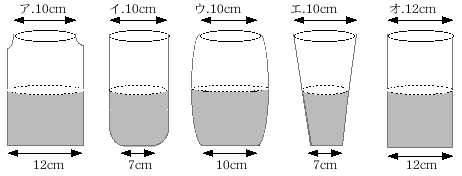 「1時間に40ミリをこえる雨量」などといいますが、雨量は体積で表 さないで、たまった雨水の深さ{mm}で表すのです。次のア〜オの容器を使って雨量を測ってみました。容器にたまった雨水は、ど れも半分ほどの深さでしたが、少しずつ差が出ました。このア〜オをたまった雨水が深い方から順に並べなさい。