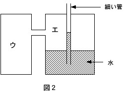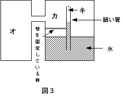 (3) 細い管の中の空気をあたためればその体積が大きくなり、管内の 水面は下がります。逆に容器の中の空気を冷やせばその体積は収縮し容器内の水面が上昇し、その結果管内の水面が下がります。