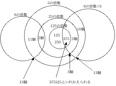 上図のように、6で割って3あまる数、6の倍数、5の倍数から重なりの部分を ひいて5の倍数の個数を求める。