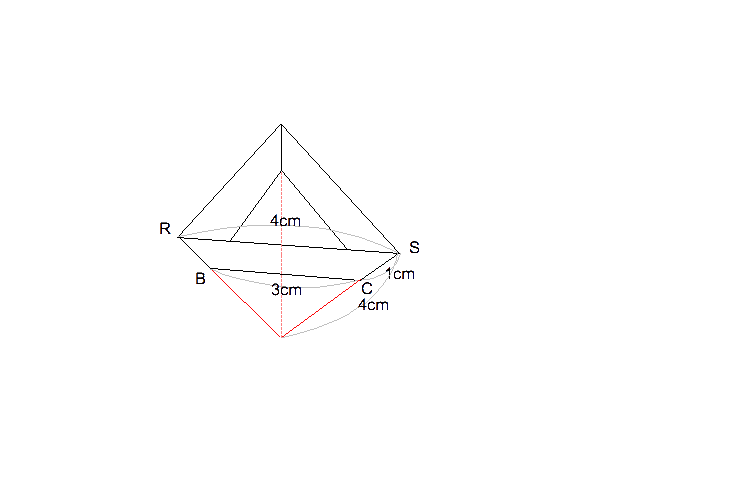 [12] 容器は正四面体を底面に平行な面で切った三角すい台にな る。辺RS:辺BC=4cm:3cmが相似比となるので、体積比は、4×4×4:3×3×3=64:27 64−27=37・・・容器の体積とする。一 方1辺が1cmの正四面体の体積を、1辺が4cmのこの正四面体の体積64と比べると、64÷(4×4×4)=1となる。37÷1=37倍