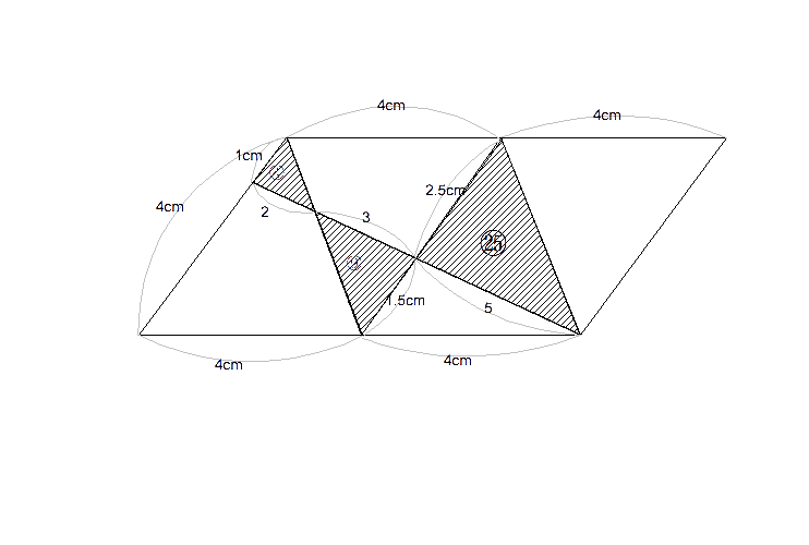 [9] 平行四辺形のまわりの長さから、1cmをひいた分だけ短いの で、8+4×3+3−1=22cmである。 斜線部のいちばん左の三角形の面積を Cとすると対応する辺の比1cm:1.5cm:2.5cm=2:3:5より3つの三角形の面積の比は、C:H:㉕となる。平行四辺形の面積は、C÷2× (2+3+5)×4×2=160となるので、3つの三角形の面積はその(4+9+25)÷160=19/80倍となる。