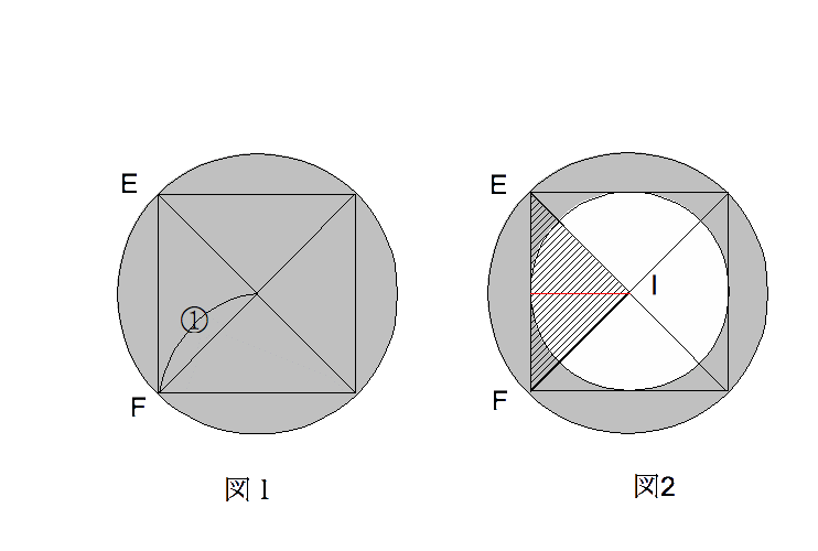 (3) 三角形EFIが通過する部分の底面は上の図2の ように、影をつけた部分になる。赤線×赤線=正 方形の面積÷4だから、赤線 を半径とする円の面積をひくと、@×@×3.14−(@×@×2)÷4×3.14=@×@×1.57㎠を底面とするくりぬかれた円すいが、三角形EFIが通過する部分となる。立体Pの底面積@×@×2と比べると、(@×@×2)÷(@×@×1.57)=0.785倍であるので、20㎠× 0.785÷2=7.85㎠となる。