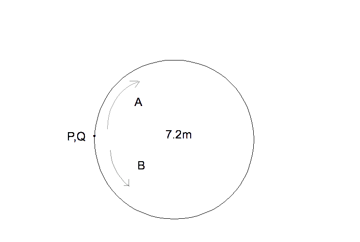 図のように1周7.2mの円のまわりをP,Qから反対方向にA,Bを回し重なったときに、Bの真下にAがいると考えられる。7.2m÷(57.6+