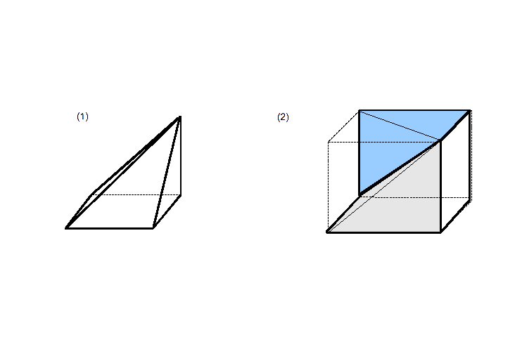 (2) (1)と同じように厚紙 Aの残り1辺が立方体の対角線になるように、折り曲げられている。いずれにしても、立方体を基本として作られた立体なので、うすく立方体の見取り図を書い ておき その上に、必要と思われる線を書き加えて 行く。下図右で、灰色と青色の面がそれぞれAの厚紙2枚にあたる。
